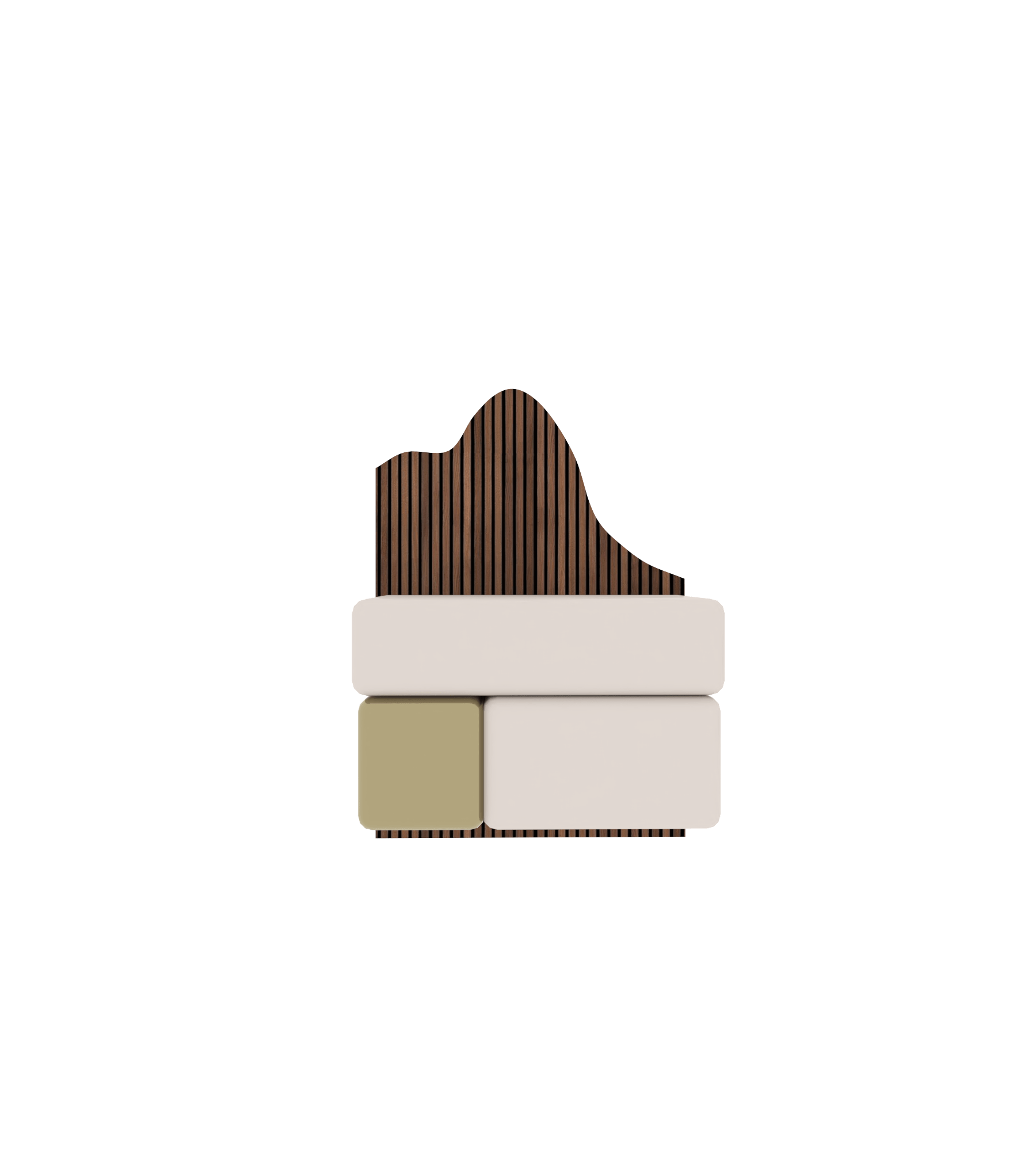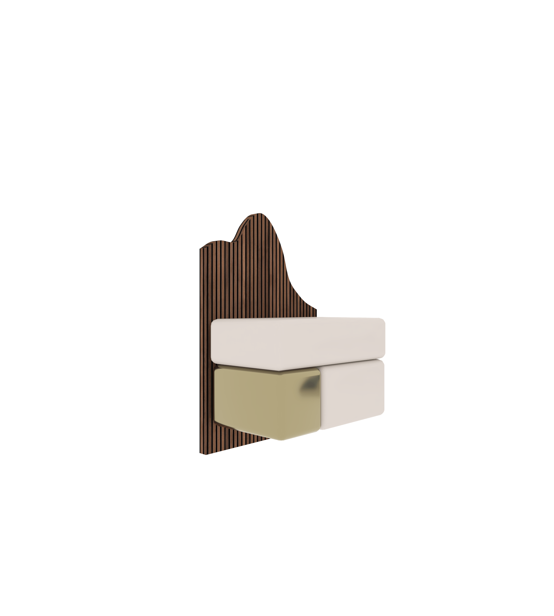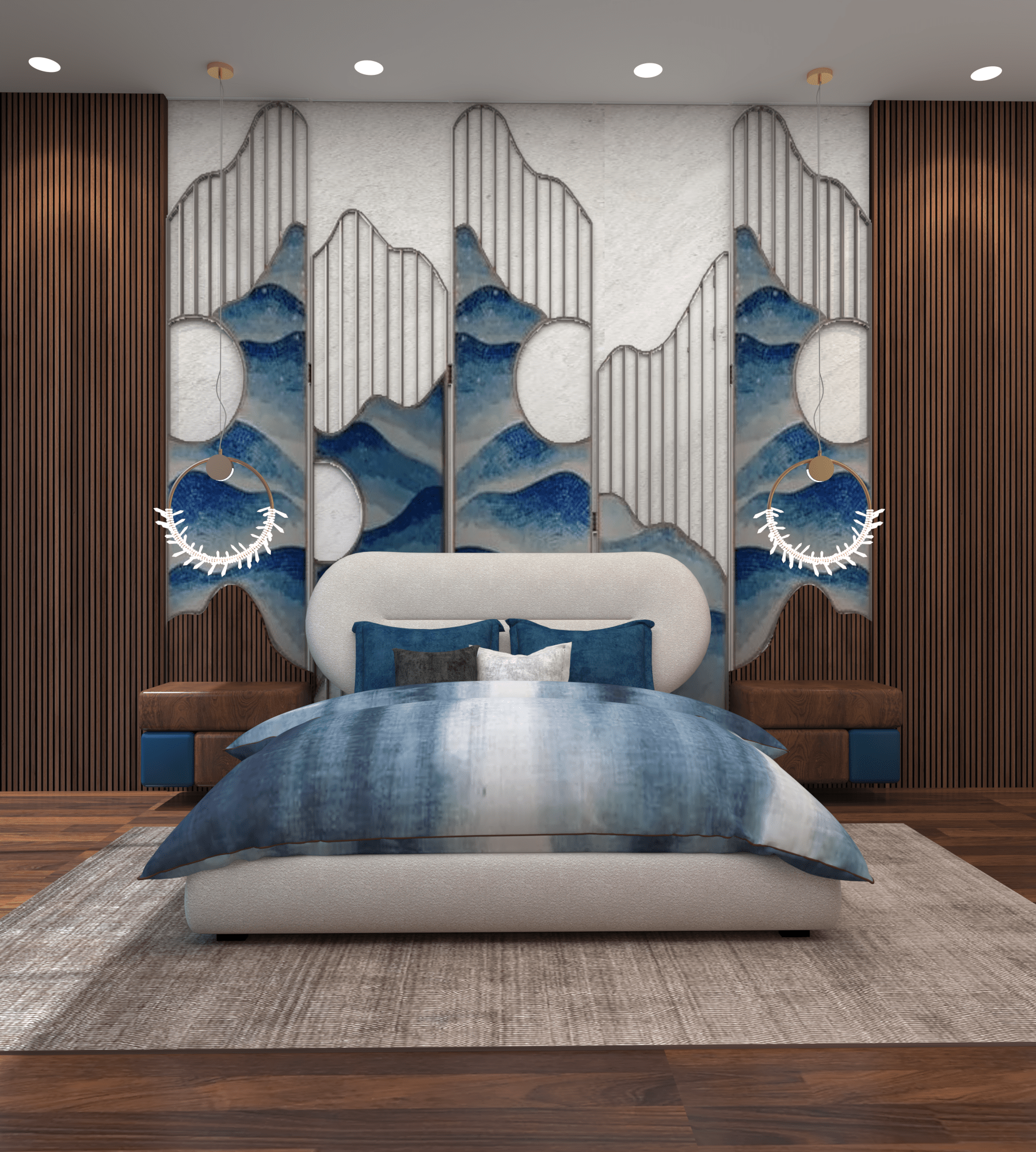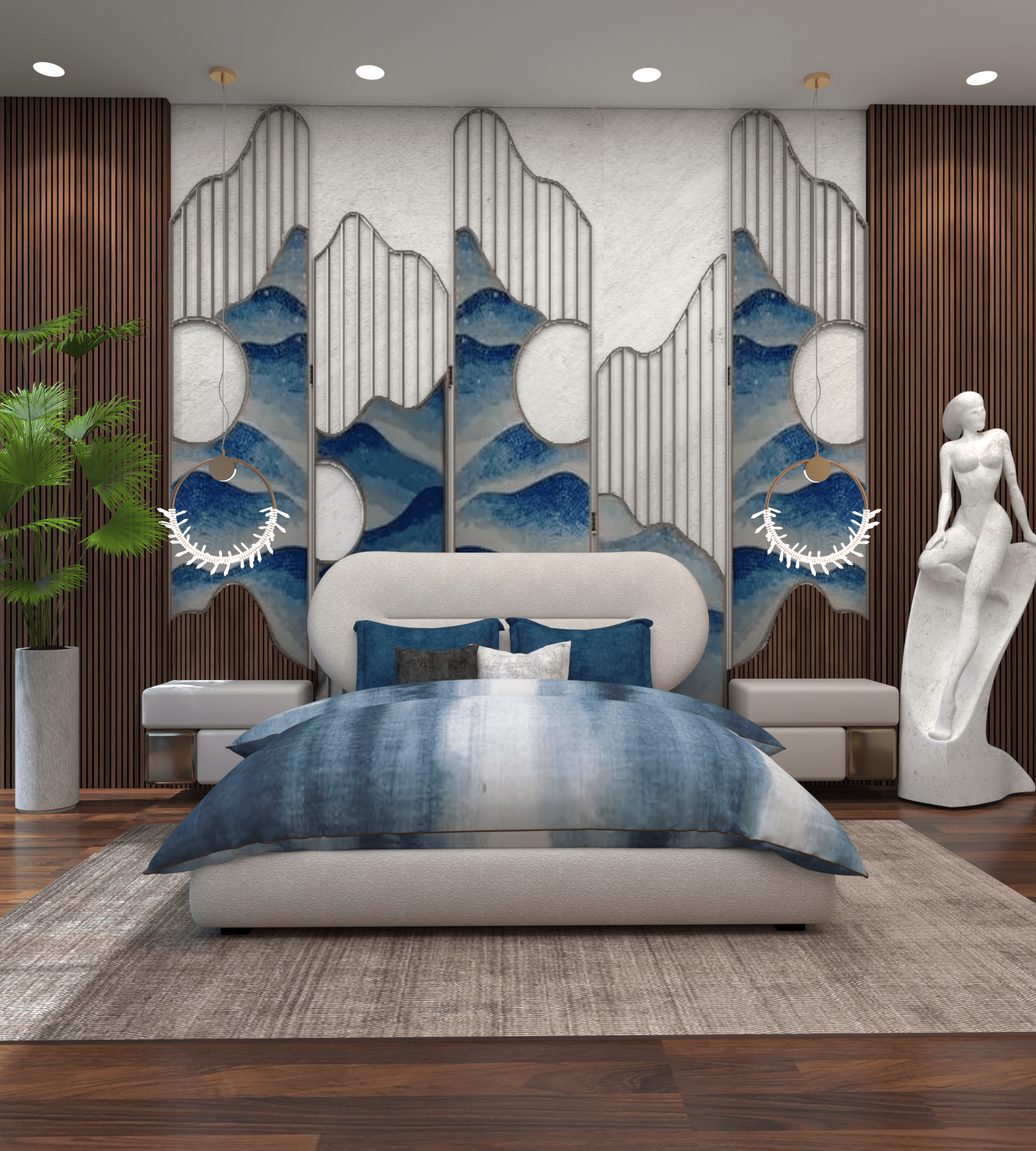 Transform your bedroom into a sanctuary of elegance with unique wall paneling featuring tinted lacquer glass and metal accents, complemented by stylish wooden louvers. The gracefully curved bed, paired with an elegant bedside table, completes this sophisticated look, creating a harmonious blend of modern design and comfort.